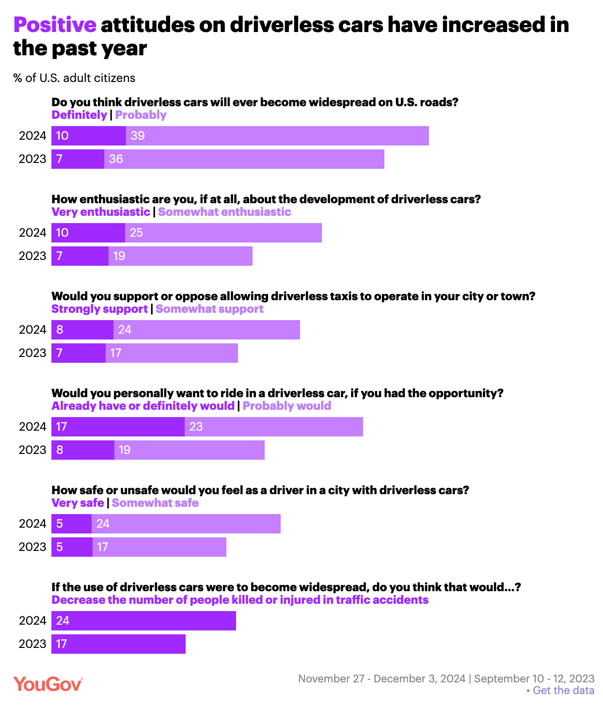 Sometimes that’s true. And it’s not the capability of the technology on its own that’s too amazing to dismiss (though the technology is amazing). It’s the value that the technology delivers to people that’s too amazing. Society accepts these things over variable time horizons, but only when the value they deliver is more powerful than the downsides— real or perceived— that come along with them. Whether you’re talking predictability, road safety, passenger safety, comfort, pedestrian safety, or something else, the value AVs deliver is so profound that it’s hard to imagine the trends in this YouGov data doing anything other than continuing in the direction towards widespread acceptance.