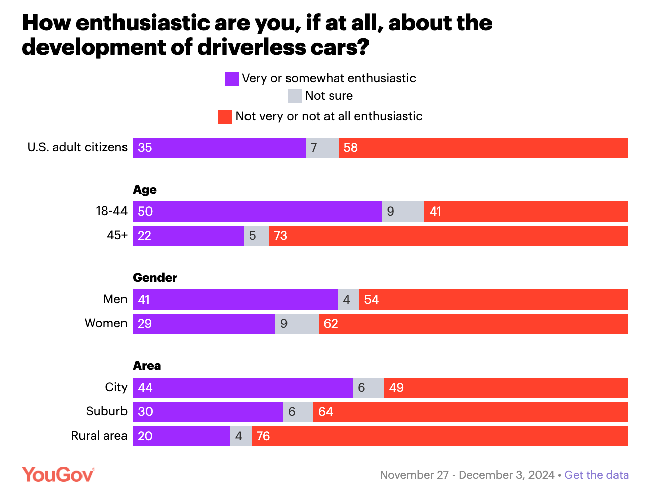 But this data from YouGov is a cold bucket of water to dump on that unbounded enthusiasm of the Bay Area. Most Americans (58%) are not enthusiastic about the development of AVs. There are interesting generational, regional, and gender enthusiasm gaps observed in the data, too: older Americans, women, and those who live in rural areas are most skeptical of them.